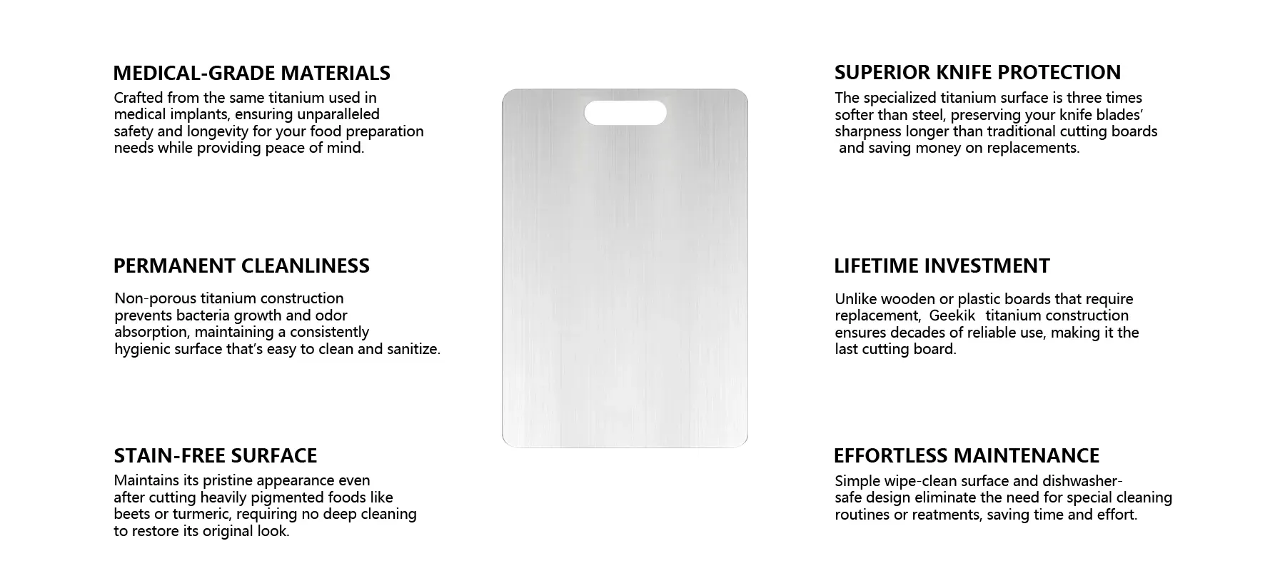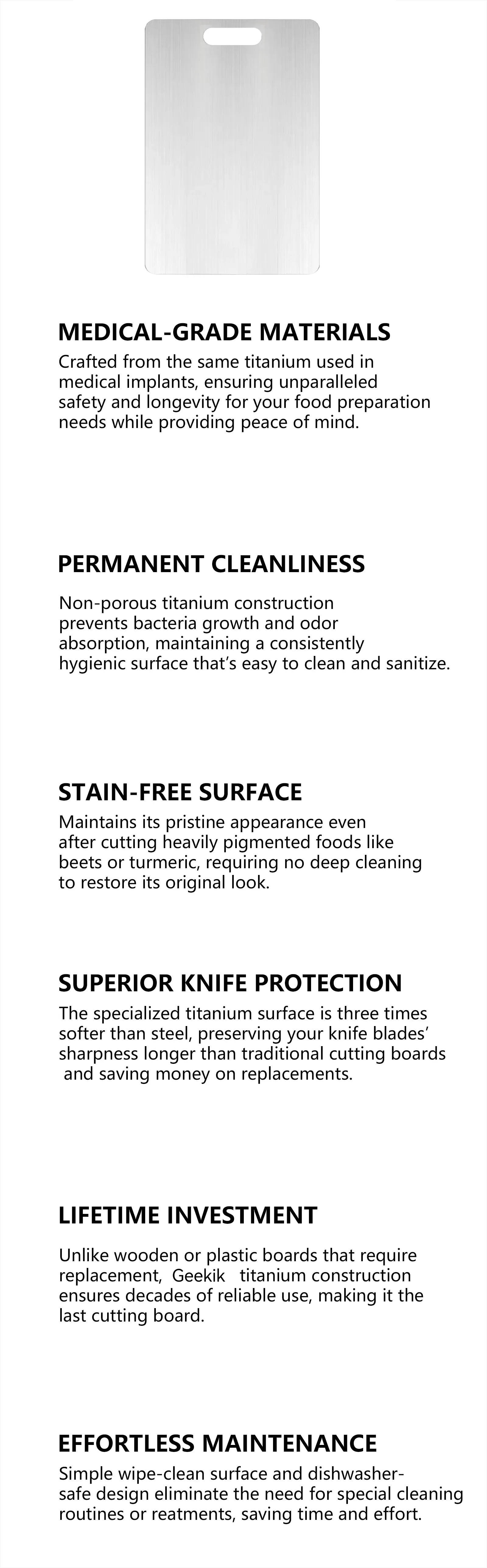 That’s why the Geekik Titanium Cutting Board was created. Made from premium stainless steel, it’s non-porous, hygienic, and built to last. Its smooth surface makes every cut effortless. The Geekik promise is simple: to deliver hygiene and durability to your kitchen, helping you create meals with ease and confidence.