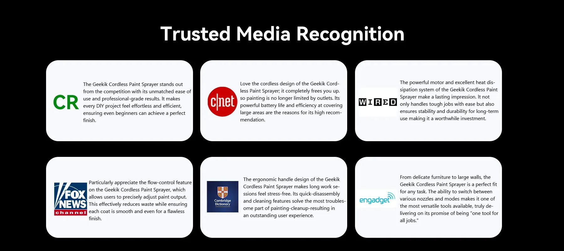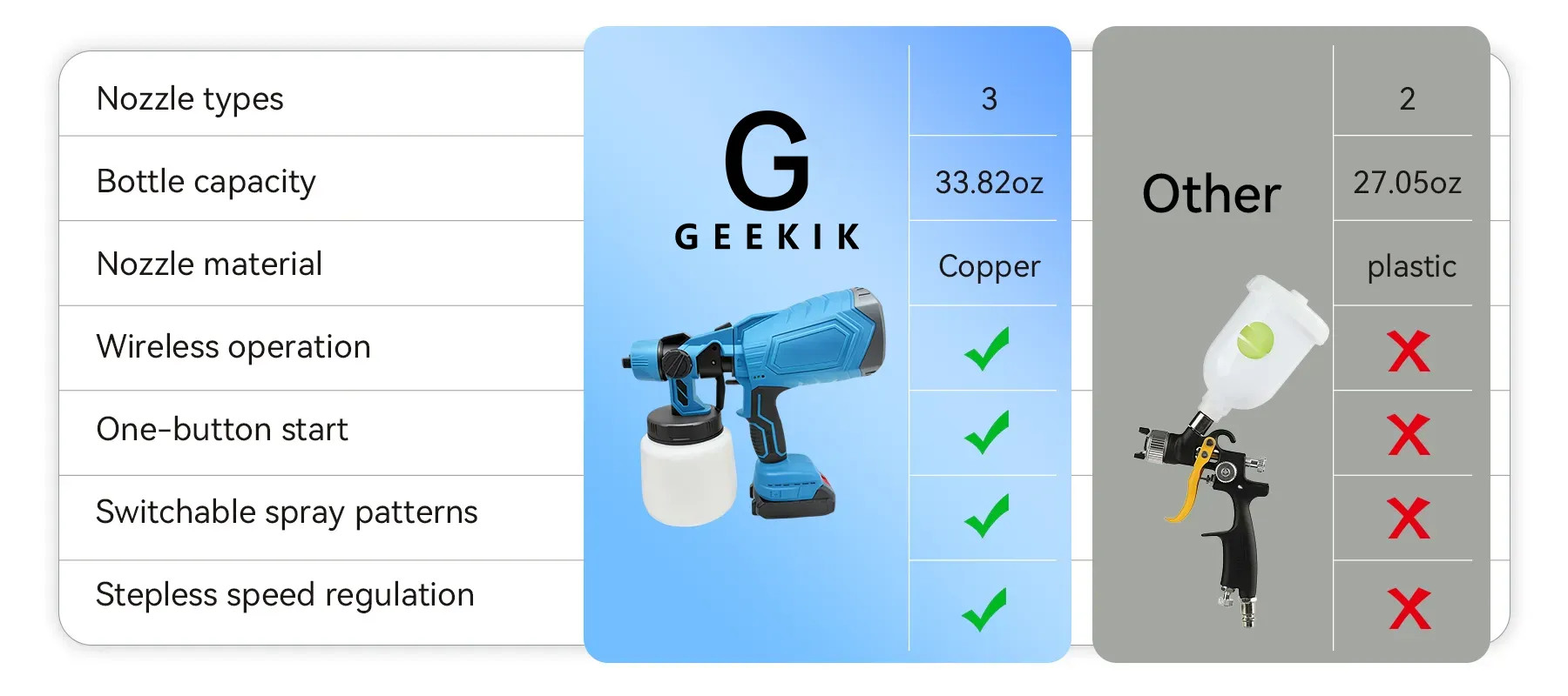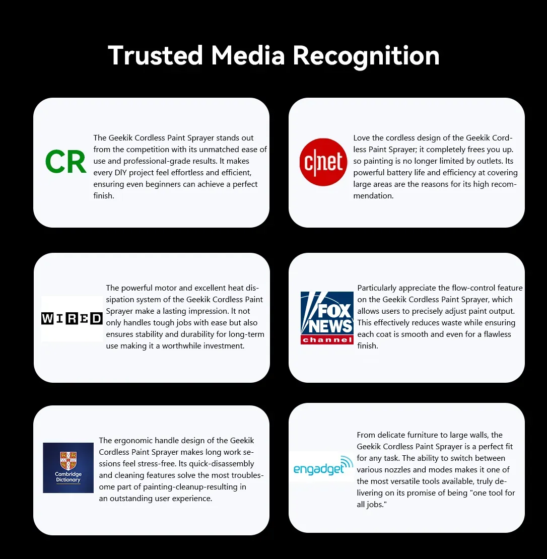 That’s how the Geekik Cordless Paint Sprayer was born. Its powerful yet user-friendly design makes spraying effortless while delivering flawless results. This reflects Geekik’s core promise: transforming tedious chores into a creative joy, so you can focus on the art of your work.